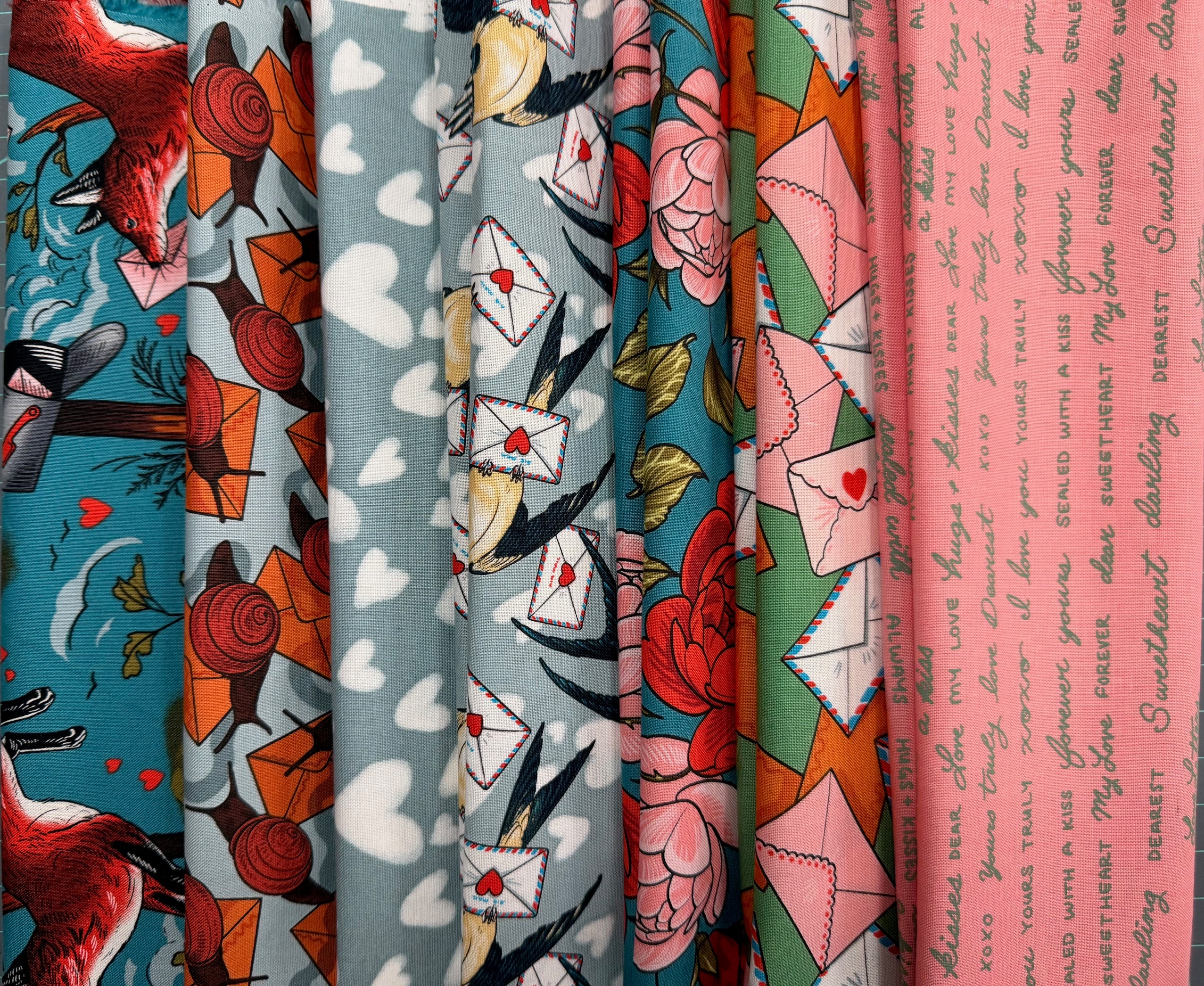 Love Letters from FreeSpirit Fabrics and designer Club Hauer.  Fun valentine collection with forest animals, snails and birds.