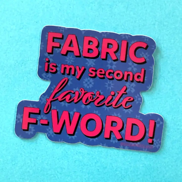 The Favorite F-word Sticker is my drawing of the phrase "Fabric is my second favorite F-word" in bright pink on a periwinkle quilt block backdrop. All our die cut stickers are made of a thick durable vinyl with a protective laminate coating. This makes the sticker resistant to fading, scratching and water. Sticker measures 3.25in wide x 2.5in tall.