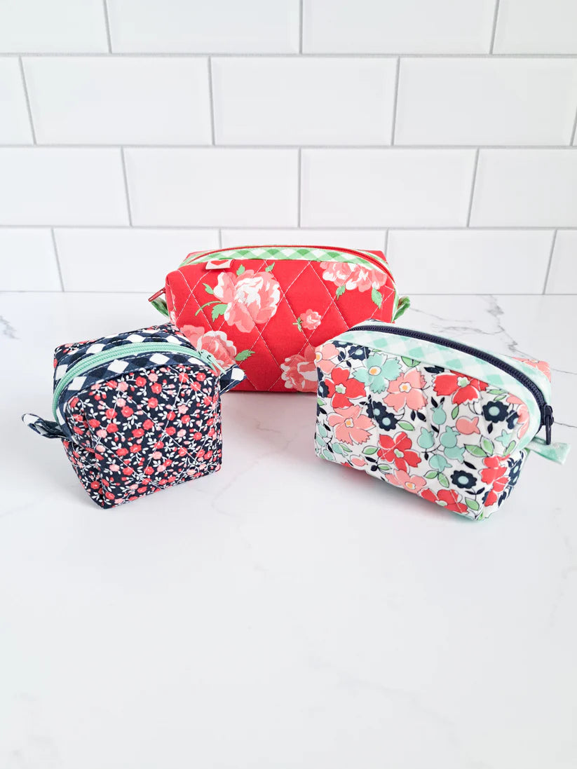 The Foxboro Pouch Pattern is a quilted zipper pouch pattern that includes three size options. These tiny boxy pouches are perfect for storing your tiniest belongings: binding clips, safety pins, spools of thread, small sewing notions, earbuds, a deck of cards, band-aids, makeup, jewelry, etc.