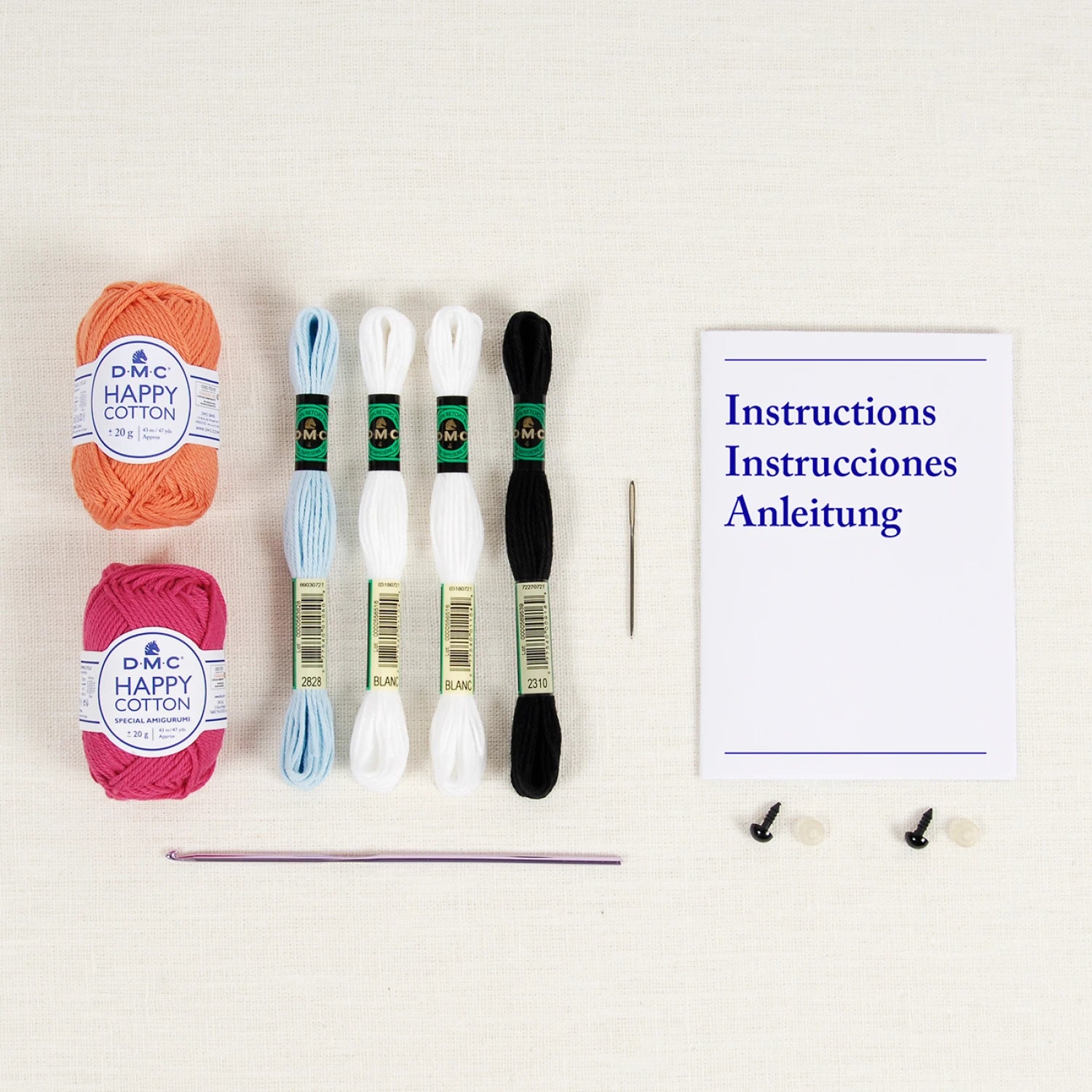 This Arigurumi Kit contains DMC Happy Cotton, a needle and complete instructions.