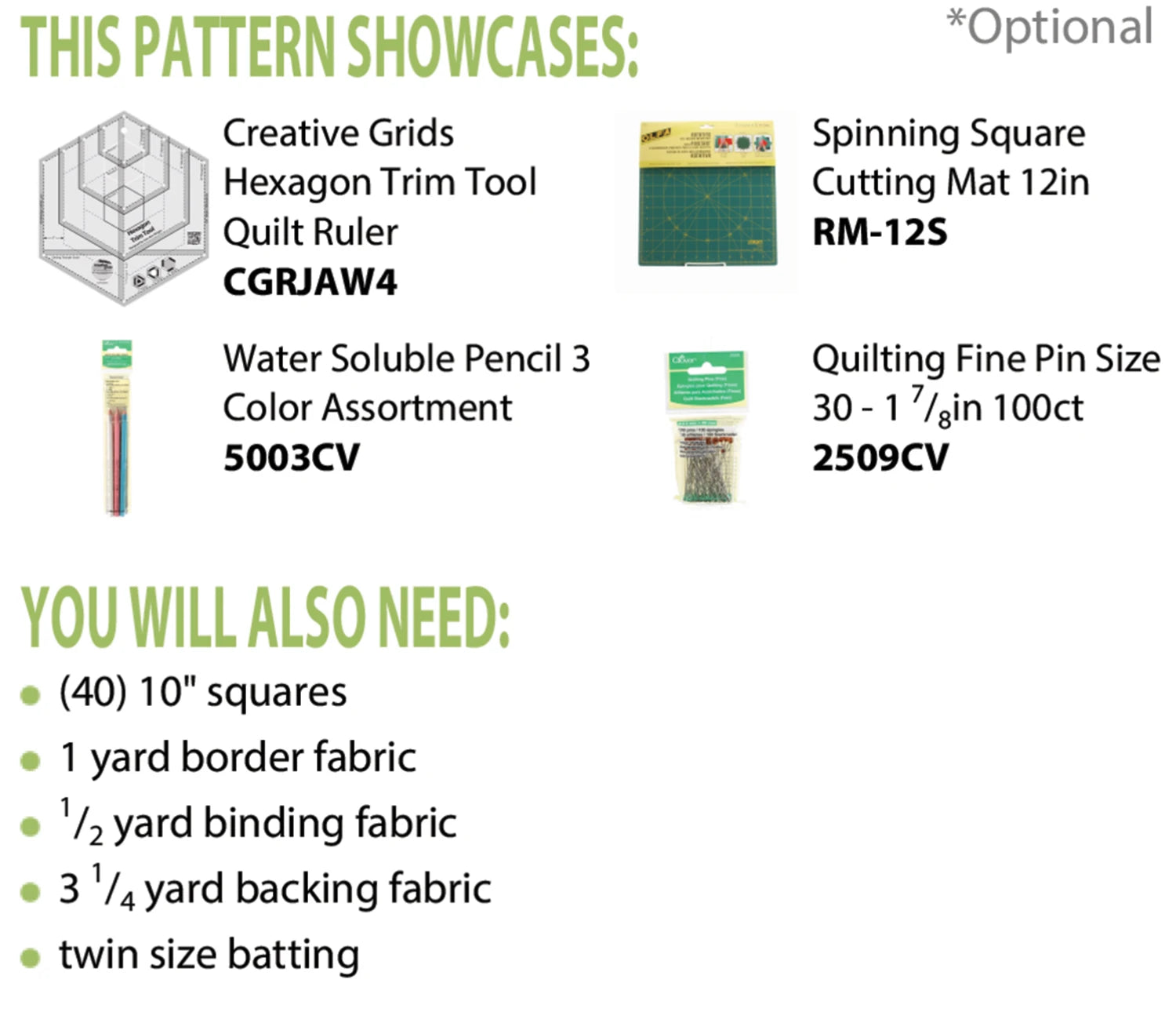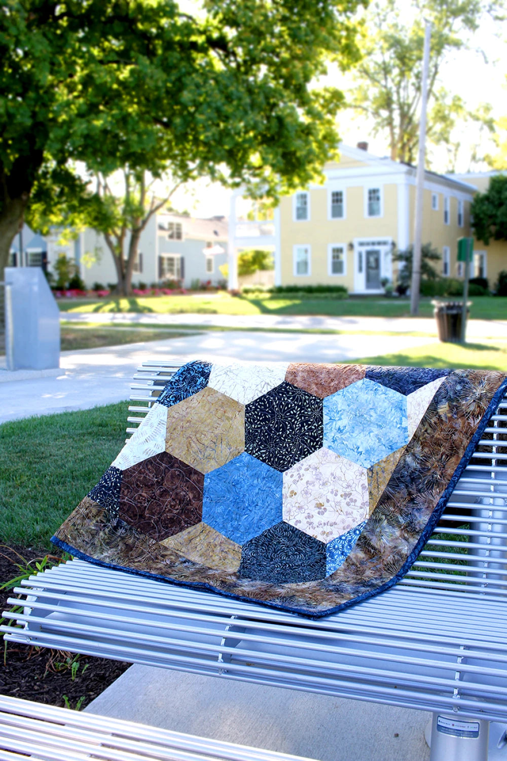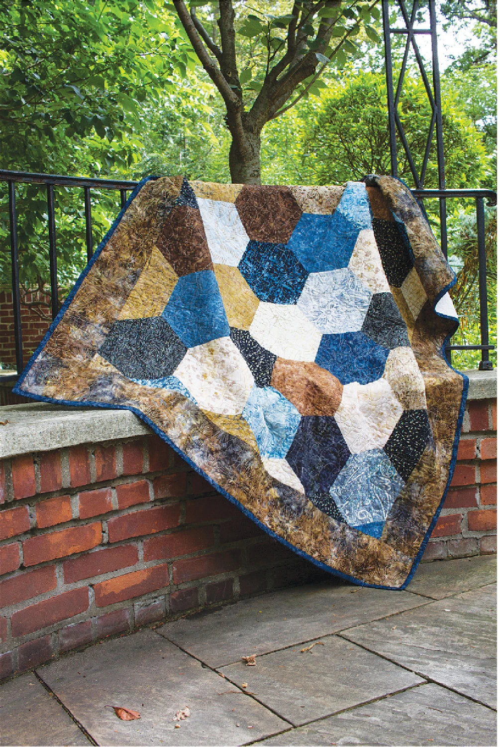 All you need is 40 ten-inch squares and the Creative Grids Hexagon Trim Tool to cut the hexies. The tool has holes drilled at each corner exactly 1/4-inch away from the edge so sewing the entire quilt on the machine is a breeze.